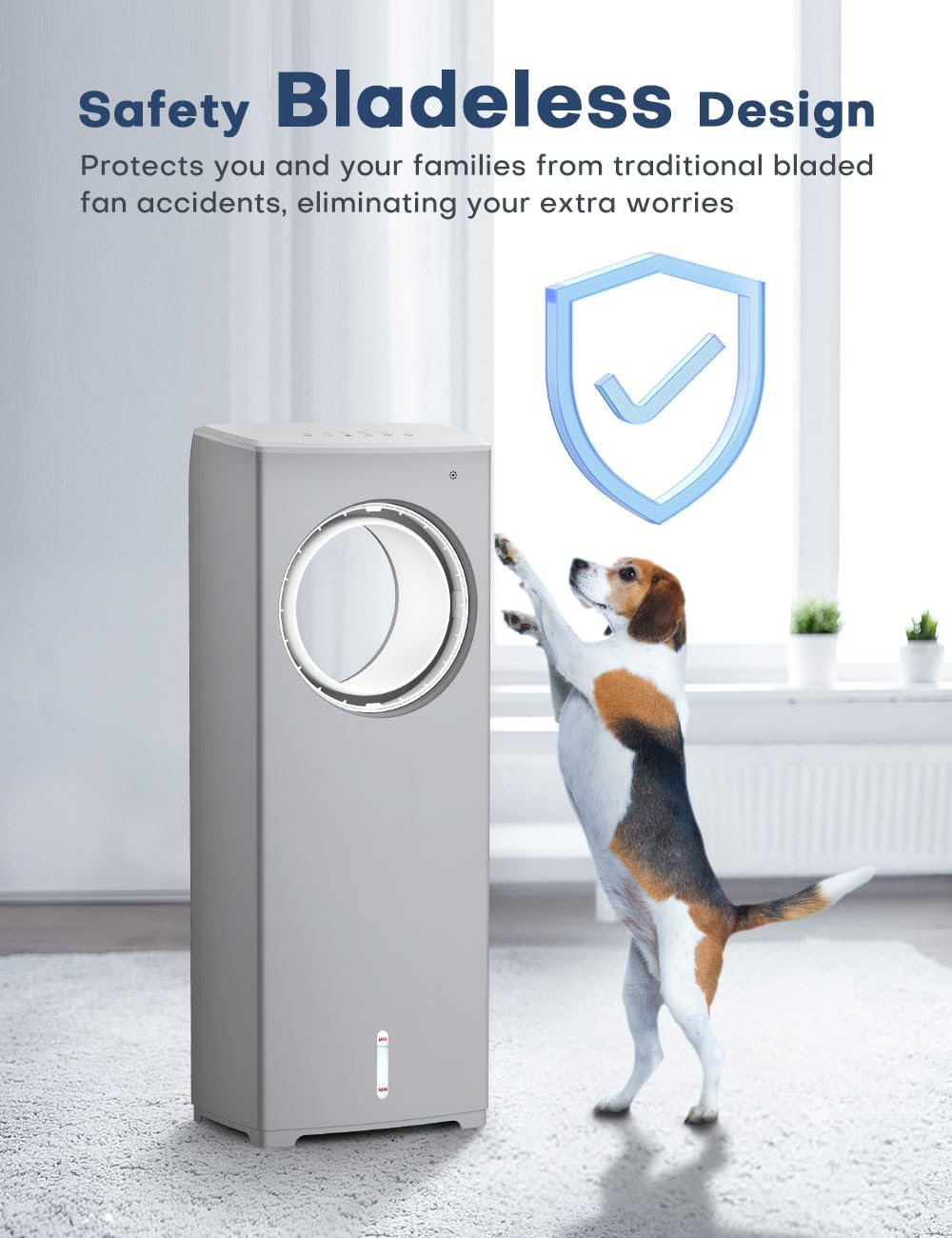 - Bladeless design: Curved air vent design eliminates fan blades, ensuring easy cleaning and safety